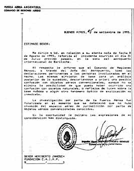Me dirijo a Ud. en relación a su atenta nota de fecha 8 de Agosto de 1995, referida al incidente ocurrido el día 31 de Julio próximo pasado, en la zona del aeropuerto internacional de Bariloche.