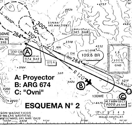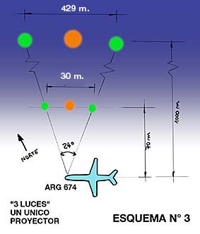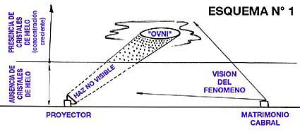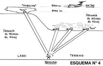 de lo contrario debería ser de un tamaño enorme. Por último, las observaciones de los gendarmes desde el GN 705 y de Blanco y Cantero desde el aeropuerto. El GN 705 en esos momentos se encontraba llegando al lago, pero a 3300 m (11000 pies) de altitud, es decir que estaba bastante arriba de la altitud mínima de los cristales de hielo, seguramente los había debajo de su posición. En esas circunstancias una luz los sobrepasa por su derecha y por debajo, dirigiéndose al lago. Es la luz de nuestro hipotético proyector incidiendo en los cristales de hielo bajo el GN 705. Al llegar el haz a las cercanías del lago, de repente, la concentración de los cristales de hielo se hace menor -o la altitud mínima donde éstos aparecen se hace mayor- como ya fue señalado. Entonces el haz se refleja en una fracción de segundo desde los cristales de hielo a unos 1800 m de altitud, a una "nubecita" a - supongamos- 3000 m de altitud, a una velocidad de varios Mach y sin producir boom sónico, por tener, como toda luz, masa despreciable. Desde el aeropuerto Blanco ve este fenómeno inmediatamente después de Gaitán y Cipuzak, de acuerdo a los datos recogidos por los ufólogos Uriondo y Gómez al entrevistarlo. Y Blanco lo describe como "el haz de una linterna apuntando hacia abajo". Cantero, por su parte, lo describe como "una luz ámbar que lo alumbraba (al ARG 674) como si fuese una linterna." ![]() Esquema N° 4 AMPLIAR Hay dos formas en que un proyector