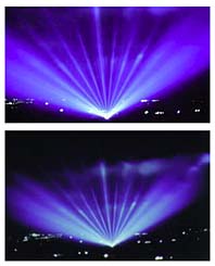 Este informe en un principio iba a referirse a un análisis de todos los testimonios que poseemos de Cipuzak, uno de los tripulantes del avión de Gendarmería Nacional (GN 705) implicado en los sucesos "ovni" de Bariloche de 1995, con el objeto de mostrar cómo sus relatos fueron modificándose con el paso del tiempo, y cómo difieren entre sí aquellos abiertamente públicos de los no tan públicos. Además se pretendía indicar algunas inconsistencias importantes en sus informes. Éste iba a ser el primero de una serie de análisis "testigo por testigo": luego de Cipuzak figuran en nuestra lista Polanco y Gaitán. Pero algunas novedades que surgieron después de la confección de nuestro informe número 1/2004 -referenciado arriba- nos obligan a posponer nuestra intención hasta mas adelante. ![]() Efectos sobre las nubes realizados mediante proyectores .