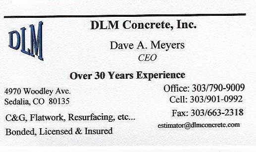 | DLM Concrete, Inc Dave Myers (303)790-9009 [email protected] |