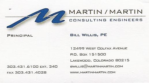 | Martin / Martin consulting Engineers Bill Willis,PE (303) 431-6100 ext.340 [email protected] martinmartin.com |