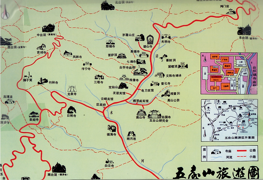 五台山,五峰聳立,頂無林木,如垒似台,故名。以其歲積堅冰,夏仍飛雪,曾無炎暑,佛經又謂清涼山。本山位於山西省東北部,由東南西北五座台頂組成。台懷是五台山的中心區,距省會太原230公里。 五台山是佛教聖地、旅遊避暑勝地和抗日革命根據地的文化活動基地。它歷史悠久,巍峨敦厚,磅礡於五台、繁峙、代縣、原平、定襄、忻州、盂縣、阜平等地。五座台頂氣象萬千,別有風姿。東台亦稱望海峰,海拔2795米,乃觀望雲海日出的理想之地;南台亦稱錦繡峰,海拔2489米,為賞花閱草的最佳之地;西台亦名掛月峰,海拔2773米,為觀看月墜峰巔的絕妙之地;北台亦名葉斗峰,海拔3058米,為華北屋脊,是賞星閱野的制高略;中台亦叫翠岩峰,海拔2892米,是滕雲躡光的玄妙之境。 五台山風光秀麗,景色怡人,空氣清新,污染極少。這裡氣候清涼,夏季平均溫度為17.9度,降雨量為460.5豪米,自官以來就是我國著名的旅遊避暑之地。 五台山雄據雁代;盤磚數州,在四關之中。左鄰恆岳,秀出千峰;右瞰滹沱,長流一帶,北陵紫塞,遏萬里之煙塵,南擁中原,為我國最大屏蔽。宋代時為楊家將及釋真寶領導的五台山僧兵抗擊遼金的重要陣地。 東漢永平十一年(公元68年),佛教傳入五台山,而五台山的顯通寺和洛陽白馬寺都是釋源宗祖。隋唐時期是佛教的鼎盛階段,大寺不計其數。此外,五台山的宗派計有:唯識宗、律宗、華嚴宗、淨土宗、密宗、天台宗、禪宗等,五台山現在成為中國佛教的「首府」,除了是文殊菩薩的道場外,也是居中國佛教四大名山之首。印度、斯里蘭卡、尼泊爾、韓國、越南、緬甸等國的僧人到這裡進行文化的交流,把這裡的華嚴學、禪學、文殊信仰、音樂、繪畫、雕塑和建築等佛教文化藝術傳到東南亞和東亞諸國。文殊信仰成為了東方各民族信徒的共同信仰,五台山也成了與印度靈鷲山齊名的佛教聖地。 精湛的佛教藝術五台山佛教歷史悠久,因其處在十年九旱的黃土高原上偏僻的五台山區,所以就保存了南北朝以來各個朝代的寺塔百餘座。以其建築材料、形制、工藝不同,構成了一個豐富多彩的古代建築群,因此被譽為「中國古代建築藝術寶庫」、「中國佛教彩塑藝術的博物館」、「中國佛教寶塔藝術的展覽館」。 教寶塔藝術 寶塔藝術是佛教建築藝術的組成部分,此處寶塔種類繁多,若以塔的材質來說,分別有木塔、磚塔、石塔、鐵塔、銅塔、銀塔、水晶塔、玉塔和琉璃塔等;就形式而言,計有:方形塔、六角形塔、八角形塔、十二角形塔;就塔之位勢而言,孤立式塔、對立式塔、排立式塔、方立式塔、拱立式塔和分立式塔。 各寺概況 1 延慶寺在五台縣善文村,寺宇坐北向南,現存金代山門、大雄寶殿及新建東西配房。大雄寶殿闊三間,長十三米,平面近方形。大殿為六架椽,歇山頂。柱頭用五鋪作單抄單昂偷心造頭拱,每間各設補間鋪一朵,前檐及兩山當心間鋪作45度傾斜,手法較古。 1 岩山寺在繁峙縣天岩村,始建於金正隆十三年(1158年)。其殿寬五間、進深三間、六架椽、歇山式。前後檐當心間設板門,由此可以穿行。 1 廣濟寺建於元至正年間(1341-1368),內裡的大雄寶殿坐北向南,五開間、懸山式,台基較高,殿前築有月台,檐柱側角升起顯著,殿內僅後槽設金柱兩根,空間廣闊。 1 殊像寺大文殊殿為鐵林果禪師於明弘治二年(1489)年新建,殿寬五間、進深三間。殿前月台長21米、闊9.8米。台基四面包有磚和條石,外表平整光滑。殿為重檐九脊剎歇山頂,八架椽。正脊中間置一個葫蘆,兩端安有鴟吻。四條垂脊、四條戧脊上置有吻、龍鳳、獅子、天馬、海馬、狻猊、斗牛、行什等飛禽走獸,以降雨滅火。殿檐用鐵質溝頭,滴水剪邊。整個大殿的彩繪以青綠為主,間以朱紅,枋心貼金。圖案清晰,色彩絢