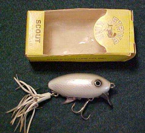 Strike King Water Scout made of wood. This lure looks to have never been fished. Color white with silver gray scale pattern. Price $12.99 |