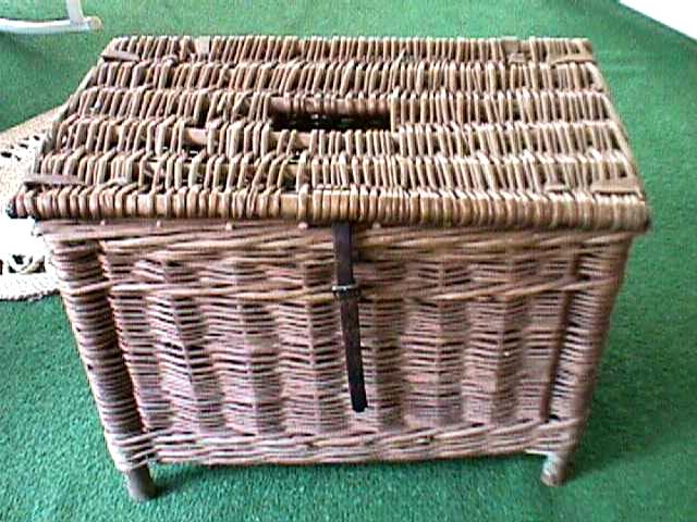 opening in the top to slide fish into. When this was made they used so type of gut or rawhide for the hinges. No broken or missing places in the wicker. Price $119