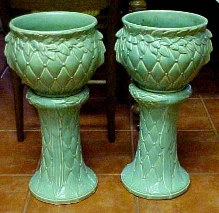 A wonderful matched pair of marked McCoy Jardinières & stands.