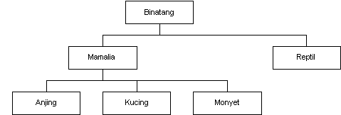 Dari hirarki diatas dapat dilihat bahwa, semakin kebawah, class akan semakin bersifat spesifik. Class mamalia memiliki seluruh sifat yang dimiliki oleh binatang, demikian halnya juga Anjing, kucing dan Monyet memiliki seluruh sifat yang diturunkan dari class mamalia. Dengan konsep ini, karakteristik yang dimiliki oleh class binatang cukup didefinisikan didefinisikan dalam class binatang saja. Class mamalia tidak perlu mendefinisikan ulang apa yang telah dimiliki oleh class binatang, karena sebagai class turunannya, ia akan mendapatkan karakteristik dari class binatang secara otomatis. Demikian juga dengan class anjing, kucing dan monyet, hanya perlu mendefinisikan karakteristik yang spesifik dimiliki oleh class-nya masing-masing. Dengan memanfaatkan konsep pewarisan ini dalam pemrograman, maka hanya perlu mendefinisikan karakteristik yang lebih umum akan didapatkan dari class darimana ia diturunkan.