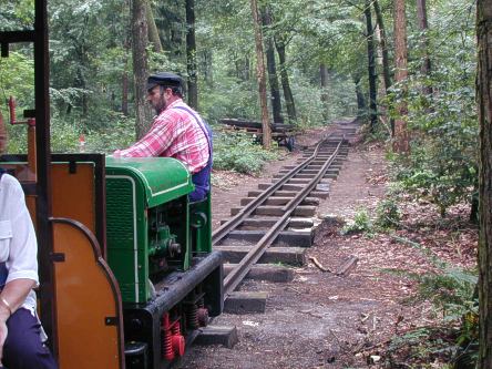 | Oeps, de rails wordt nog smaller! Tot hier is de rails nu gelegd in het bos. Oh dear, even narrower track !! This is as far as tracklaying is finished in the woods foto's/pictures 06 2001 |