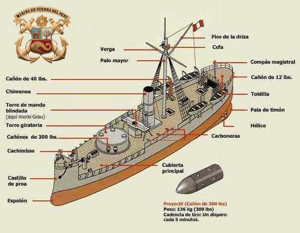 Jorge Basadre Grohmann ofrece esta imagen del monitor blindado Huáscar: ".....construido en 1864 por Birkenhead Iron Works, Inglaterra de 1,100 toneladas, 300 H.P., 2 cañones de 300, 2 de 40 y otros, armadura de cuatro pulgadas y media.....". |