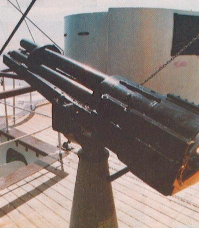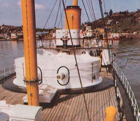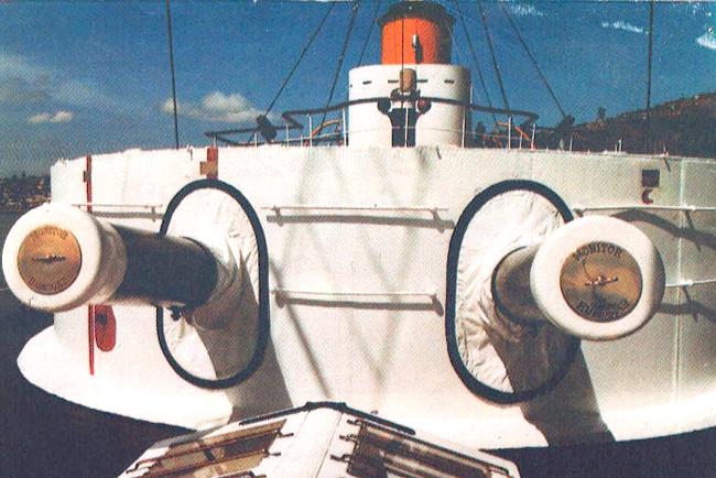 Tres fotos de los cañones del Huáscar Las dos primeras fotos muestran los cañones Elswick de 8 pulgadas (que reemplazaron a los Armstrong de 10 pulgadas, que disparaban proyectiles de 300 libras), desplegados en la torreta giratoria, llamada Torre Coles en honor a su diseñador, el Capitán Británico Cowper Coles. La torreta tenía un blindaje de cinco pulgadas y media, era operada manualmente y podía dar un giro de 360 grados en 15 minutos, facilitando la orientación de los cañones. Estaba protegida con un blindaje grueso. Después de su captura por los chilenos, ellos adaptaron un sistema a vapor que hizo la rotación mas rápida y mas fácil. En la parte inferior de la pagina, una ametralladora Gatling calibre 44 de cañón múltiple.