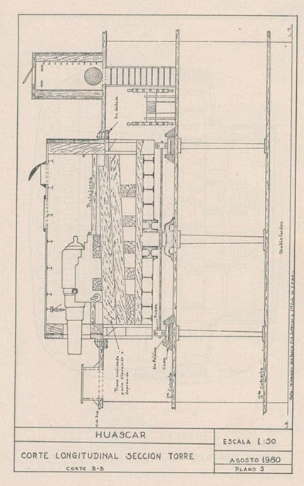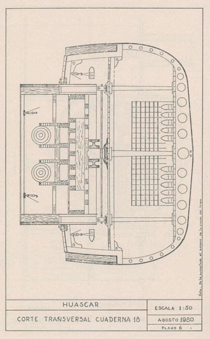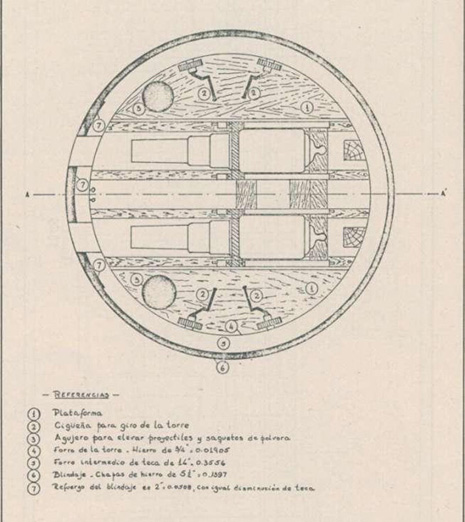 Una colección de tres ilustraciones de los planos de la torre Coles, hechas en 1980 por el Sr. Gonzalo Maguiña, probablemente copiadas de los planos originales hechos por el Capitán británico Cowper Coles. La primera, arriba, muestra muy claramente la plataforma redonda, el mecanismo que permitía la rotación de la torre, la armadura de hierro y madera de teca, y los dos cañones Armstrong de a 500. Abajo, una vista transversal y longitudinal de la torreta. (Dibujos, cortesía del Sr. Gonzalo Maguiña).