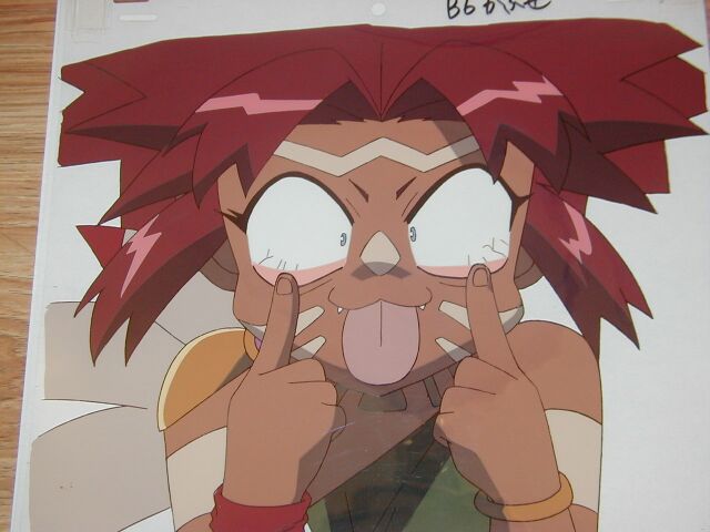 This is my favorite Tanya cel. It is from episode 3 when Tanya is mocking Itchan. As you can see she has a great goofy pose. The cel is double layered. |