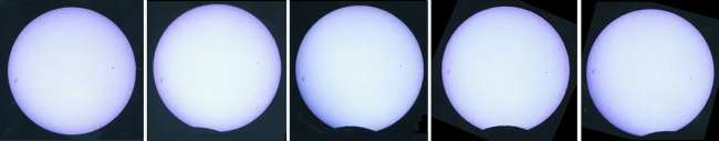 | Partial Solar Eclipse as seen from Sultanpur, Haryana, (close to New Delhi) India, on May 31th, 2003. This image was taken with a Pentax Spotmatic SLR using a Kodak Gold 400 ASA negative film @ 1/125th of sec exposure through a Meade 6-inch F/8 Dobsonian prime focus. An off-axis Baader Solar Filter (55mm) was used to cut the light. |