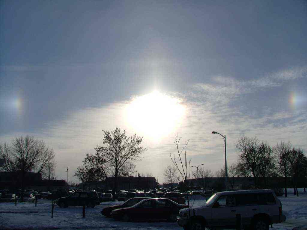 | My first sundogs! Two sundogs are seen on either side of the sun in this image taken on an afternoon from my parkinglot in Grand Forks, North Dakota, with my Fuji s5000 dgitial camera. |