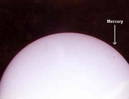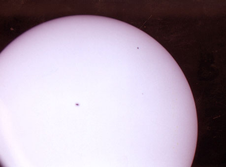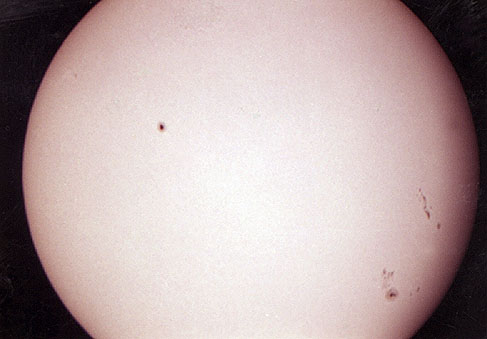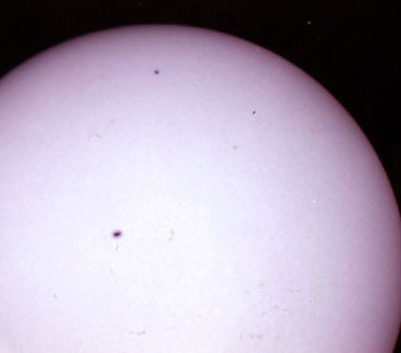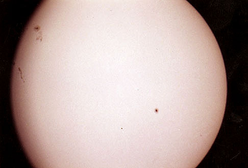 | Transit of Mercury as seen from New Delhi, India, on May 7th, 2003. This image was taken with a Pentax Spotmatic SLR using a Kodak Gold 400 ASA negative film @ 1/125th of sec exposure through a Meade 12-inch LX200 F/10 prime focus. An off-axis Baader Solar Filter (75mm) was used to cut the light. |