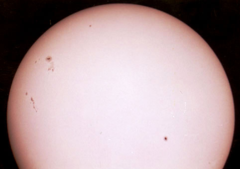 | Sunspots! This image was taken with a Pentax Spotmatic SLR using a Kodak Gold 400 ASA negative film @ 1/125th of sec exposure through a Meade 12-inch LX200 F/10 prime focus. An off-axis Baader Solar Filter (75mm) was used to cut the light. |