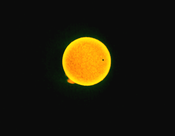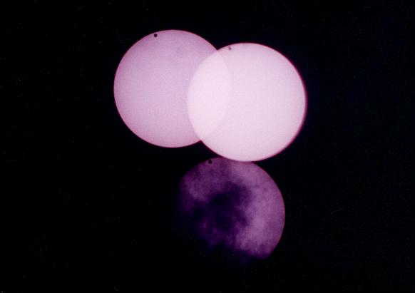 | My first try at H-alpha image processing. I used a method described in the July 2004 issue of Sky and Telescope to get the false color images of the transit. The right image is noisy because of clouds. Images were processed in Photoshop 7.0. The images were shot using Fuji finepix s5000 digital camera using eyepiece projection (40mm) on the Tele Vue Ranger with Coronado H-alpha filter. |