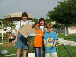 | KIds from the US Embassy pose with the American School's 6-inch Meade dobsonian telescope after the transit. The scope was primarily used to show the event to the public. |