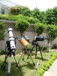 | Instruments used for the transit. (L to R) Meade 5-inch refractor on LXD55 mount (UND), Celestron Orange Tube 8-inch SCT and Tele Vue Ranger with Coronado H-alpah filter on Celestron Advanced CG-5 GOTO mount (UND), Celestron C8 black tube (Penn State U.), Celestron 80mm F/5 short tube (thanks Darrel) on Byers Cam-trak mount (my personal instrument). The 5-inch was used visually for observing the transit, Orange tube C8 had digital video setup, the H-alpha scope was used with my Fuji finepix s5000 digital camera for still shots, Black C8 had an ST9E for full disk images and the 80mm was used for the main webcast during the transit with a Philips ToUCam. |