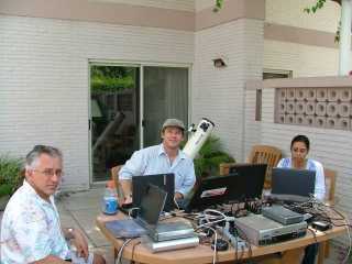 | (L to R) Ron, Tim Young and Pratibha testing the computer network prior to the transit on June 6th. |