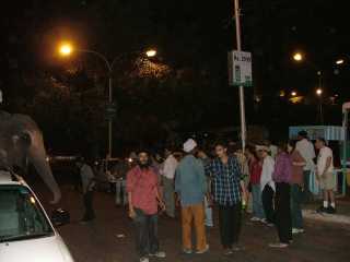 | Elephant Encounter! Large Indian elephant landed outside our hotel a few nights before the transit. Tim and Ron check out the animal from a safe distance! |