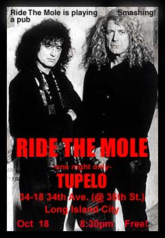 | October 18, 2001 Tupelo 34-18 34th Ave, L.I.C. Tupelo is great. This cozy Queens club loves having us, and we love playing there. We tuned up, turned down and tied one on. The show was a slight departure, with drum machines and acoustics in place of distortion and feedback. The response was good, if only because people could actually understand the lyrics. We pulled out a couple of oldies (City Girl, Swivelbone) as well as Communication Breakdown and John's new one Well Enough Alone.Thanks to Evan, the owner, for supporting us, Roger the sound guy and Greg for the 12-string. |