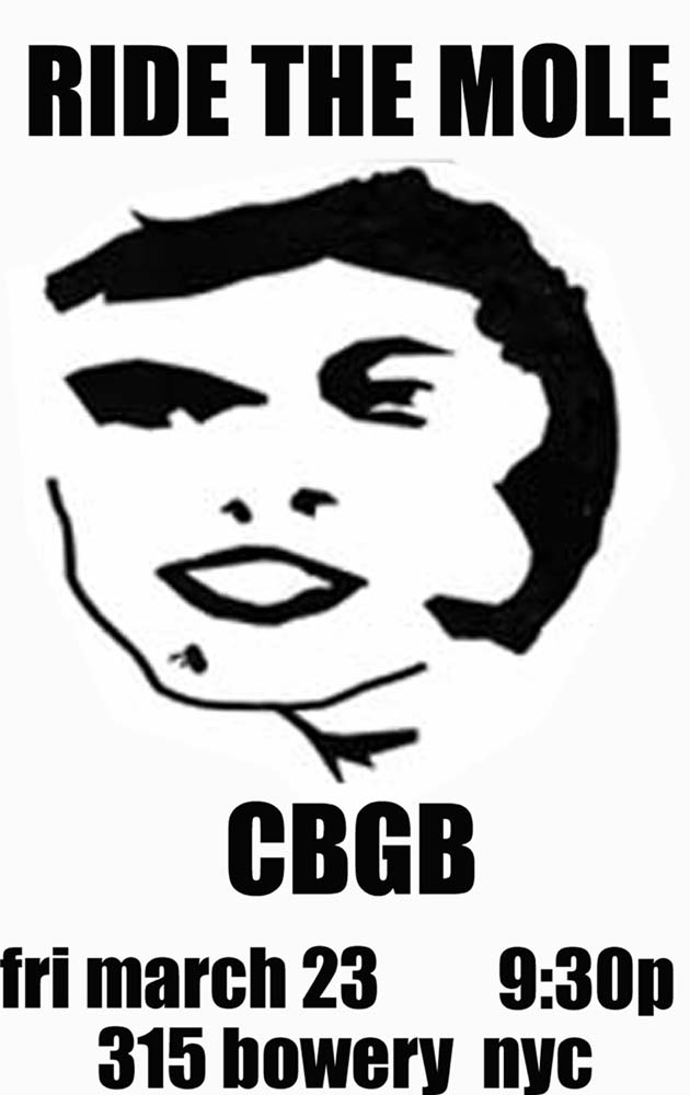 | March 23, 2001 CBGB 315 Bowery NYC Despite a couple setbacks (short set, steep cover charge, plus Peter twisted his ankle) this was a good show. Two punk guys stood in front of the stage and danced their asses off through the entire set. They were getting very creative: I had never seen the "Drag Your Broken Leg" dance or the "Fly Like An Airplane" dance before. The dancing got us all charged up, our energy level was in the red and the crowd got into it. We did a new cover, The Wailers' "Out of Our Tree" (Nuggets garage rock, not Marley). At the end of the show I dropped to the floor and thrashed around and Peter knocked over his drum kit- It was great! The set list was: Didn't Mean, It All Comes Out When I Wash, Insincerity, Carnage, Empty, Out of Our Tree, Don't Touch Me and Ride The Mole. |
