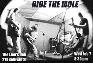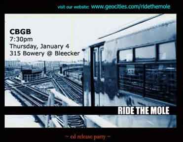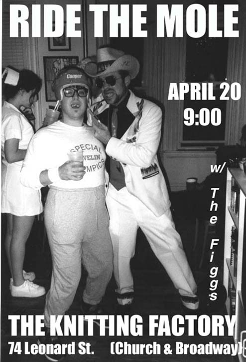 | April 20, 2001 The Knitting Factory 74 Leonard St. NYC Friday night marked the Mole's debut at this downtown venue. The Knitting Factory folks treated us real fine. Lots of beer and fresh towels were included as perks (soiled towels are available to the highest on-line bidder.) A lot of good people came out to the show and were very kind to us. Thanks everybody. The performance itself was inspired, if a bit sloppy. There's nothing like being well rehearsed. Ted's rockstar jumps are near perfect. Thanks to the Figgs for a rousing set and for the scotch. Click here for pictures. |