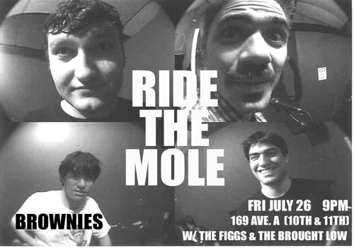 | Brownies 169 Avenue A July 26, 2002 We finally played this venerable east village rock club, and just in time because they are now closed down. The show was a smashing success: A lot of our friends came out to catch our sloppy antics and high-spirited rock. Thanks to everyone who made it down. We played a lot of brand-new numbers that we have been working on, like Do What You Want, Everything Falls Apart and Fighting. Plus we threw in some oldies- our set ended with a fiery twin-guitar solo during Hey. The Brought Low was totally rocking, and The Figgs were in top form for their farewell Brownies performance. A great night. Thanks to Mike Stuto and Mike, Pete & Pete. Click here for pictures. |