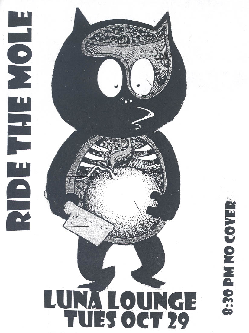 | Luna Lounge 171 Ludlow St. Oct 29, 2002 Happy Halloween from Ride The Mole. We dressed up for this one-- Ted took Best In Show with his shamanic ensemble, and we owe Patty a t-shirt for her knowledge of 80's trivia. We played a bunch of new ones again (opened with Do What You Want), and ended the show with Moira's favorite Loose Me. The other band on the bill, The Big Sleep, were friendly and rocked out a psychedelic set. Click here for pictures. |