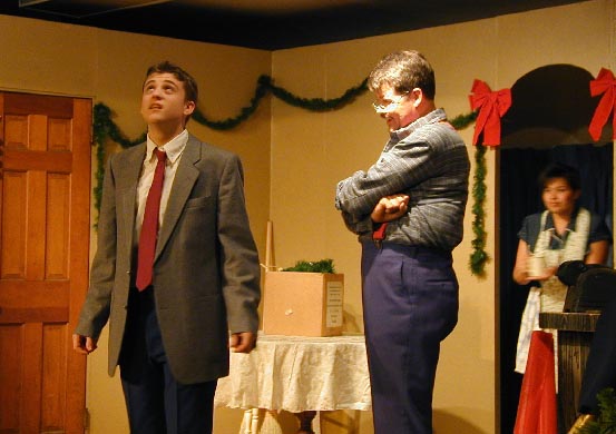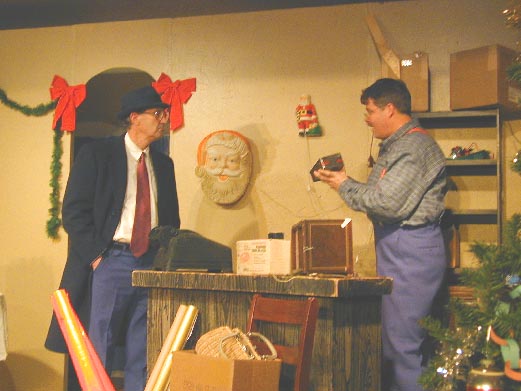 J. D. Morse, disillusioned by the holiday season, has been looking high and low for a special Christmas gift for his grandson. He finds a flier on his car windshield and wanders into Nick's Emporium, an old-fashioned store full of all sorts of gifts and knickknacks. He has a hard time explaining to Nick what he's looking for, but finds himself falling under the old storekeeper's spell. Just when Morse is about to buy something, he runs outside to chase some kids away from his car. When he returns, he finds the store suddenly dark and quiet. A policeman then shows up to run him off because, "This place ain't been open in 40 years!" Morse finds a way back, not only to the store, but to a time 40 years ago when he was a younger man. This Yuletide fantasy is full of humor and the holiday spirit and makes us all wish we could find a "Nick's Emporium" where life stands still and we can all truly enjoy A LITTLE CHRISTMAS SPIRIT. This production was performed in December 2000.