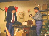 J.D. Morse (Jim Naylor, left) tries to explain what he's looking for to shopkeeper Nick (Ed Asher)