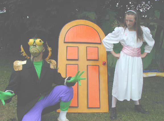 Jim Crockett as the Frog Footman and Hanna Noel as Alice