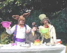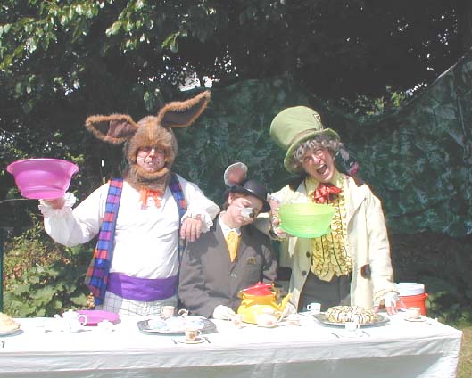 Charles Beck as the March Hare, Lori Cole as the Dormouse, and Brian Irons as the Mad Hatter.