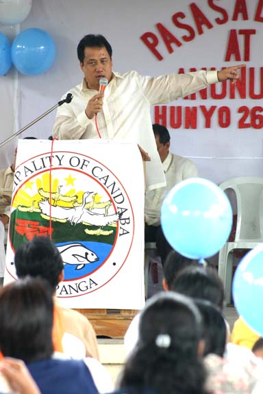 Income losses of the municipal government were drastically cut. Illegal water and electric connections that accounted for the bulk of some P3 Million losses in operating the public market were removed. Market fees and dues were standardized. Collections for the market alone more than tripled. Illegal structures within the market perimeter were removed without exemption. All vendors were moved inside the market to make enough room for traffic around the market. The market was cleaned, renovated and provided with newly installed comfort rooms for vendors and buyers. The Office of the Mayor was made more accessible by disallowing any cordon sanitaire and keeping the door literally open to anyone who wants to see the mayor. Regular consultations and dialogues with the different sectors were held at the barangay level to keep abreast with the local situation and unify the people in solving various problems of the communities. Strict discipline among the town�s policemen was imposed. Carrying of firearms when not in uniform, drinking or playing cards while on duty and sleeping on the job were firmly prohibited. On Oct.1-2, 2004 the First Candaba Seminar-Workshop on Peace and Order was held right within Candaba at the Mayor�s compound. Intended to refresh and enhance the knowledge of policemen and their cooperating barangay personnel on law enforcement and strengthen their bonding, the activity was attended by all policemen, barangay captains and leaders of tanods of the municipality. Guest of honor was Sen. Francis �Kiko� Pangilinan who also met leaders of farmers on the same day. A program to encourage and enforce the registration of tricycles and their drivers with the municipal government and the LTO for security and control purposes was initiated in cooperation with the leaders of the different barangay TODAs setting a deadline for total compliance. AdvocacyDrive against waste-dumping in the Candaba swamp