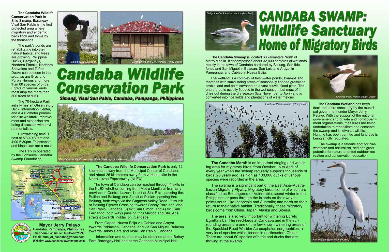 The municipality of Candaba actively participated in the Asian Waterbird Census 2005. It hosted representatives of the Protected Areas and Wildlife Bureau of the DENR, Wild Bird Club of the Philippines, Haribon Foundation, Conserve Candaba Swamp Foundation, Candaba Swamp Migratory Birds and Wildlife Foundation Inc., Kaakbay sa Kalikasan and other enthusiasts on January 15-16, 2005 for that purpose.