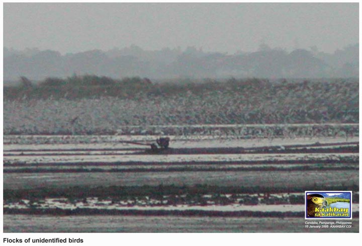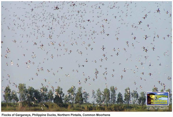 Based on the census, some 35 species of waterbirds were seen totalling some 10,200 individuals within a 200 hectare census area. Very significant was the large number of Philippine ducks sighted together with three more species of wild ducks: garganey, northern shoveler and northern pintail. The wild ducks alone totalled more than 3,000 within the census area. Tim Fisher, an authority on Philippine birds identified another species of waterbird during the census that has not been seen in the Candaba swamp for the last ten years - the purple gallinule. Download Census Report for 2005 and see photos of the Census in 2006. See how numerous the birds are: 1. Wild Ducks 2. Unidentified flock)
