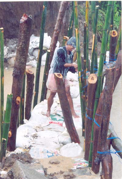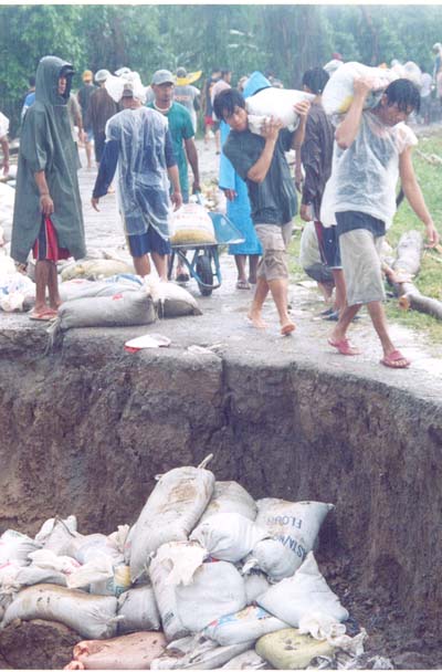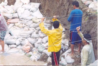 Radio and television carried the call for help to prevent the breaching of the Arnedo Dike. The DPWH was early at the site but could not do anything but to make the assurance for the mobilization of the needed equipment and materials in ten days. But things could not wait. Typhoon Marce was to make a landfall in two days and the current in the river was getting stronger and the water level was fast rising. Mayor Pelayo mobilized his constituents and started sandbagging the eroding dike. Donations of empty sacks from concerned persons and establishments came one after the other. So did donations of sand.