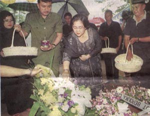 Guntur mencium adiknya Rachmawati, yang sedang terisak-isak. Rachma, yang terkenal vokal menentang pemerintahan Megawati, berbincang dengan Taufik Kiemas. Itulah pertemuan pertama keduanya sejak tiga tahun terakhir ini. Sukmawati tak datang karena sakit, sedangkan Megawati hadir di Taman Pemakaman Umum (TPU) Karet Bivak. Kematian Hartini telah membuat hampir seluruh keluarga besar Bung Karno berkumpul. Sekitar pukul 12.30, di tengah rintik hujan, iring-iringan jenazah bergerak ke TPU Karet Bivak. Pukul 13.32, jenazah Hartini dikebumikan - sekitar 10 meter dari makam putranya, Taufan, yang meninggal 17 Januari 1986. Pukul 12.57, Megawati datang. Beberapa menit kemudian Wakil Presiden Hamzah Haz dan istri datang.