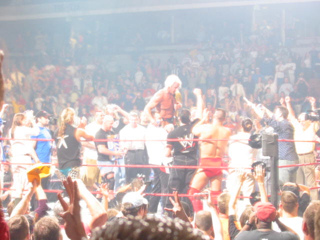 | - There's nothing like being at a live WWE event. RAW last night was purely awesome. It's too bad that everyone who watched on tv missed the special moment involving Ric Flair after RAW went off the air. As I child that grew up just 30 miles frome Greenville, SC, I had the opportunity to see Ric Flair in the old Memorial Auditorium on many Monday nights back in the 80s. I am an 26 year old WRESTLING fan that appreciates what Flair means to this business. I've met him and shook his hand just 6 years ago, and "The Man" was as humble as any I've met. Last night may have just been the best moment I've experienced in my 19 years as a wrestling fan. - I want to recap the ending of RAW and the beginning of a tribute of the "dirtiest player in the game". Nash came down to chase away Triple H and check on the "Nature Boy". Then the cameras stopped rolling on TNN, and the magic started. HBK's music hits and he comes down the ramp to a great ovation. Following him are most of the superstars from the locker room, all applauding. They all enter the ring to hug Flair, then the glass hits! Austin makes his way into the ring and out the other side to grab his beer cooler. He gives one to Ric and then begins to give the rest of the superstars beers. Next, Stephanie McMahon's music hits, and she comes down to the ring to offer her thanks. Then, Shane O'Mac dances his way down the ramp. And then Vince McMahon himself struts to the ring to confront Flair. After a little staredown, Vinnie Mac smiles and hugs Flair. That was so damn cool. Triple H comes back down to the ring, greeted by boos....especially from my row. Shane O'Mac holds the ropes for Triple H to enter...Triple H is not even in the family yet, and already big brother Shane is "whipped". Well, the superstars part to each side of Flair as Triple H and Flair stare down one another. Then the coolest thing happens as Triple H puts the World Title on Flair's shoulder and raises his arm. The crowd goes crazy for this. The superstars lift Flair on their shoulders and carry him around the ring to a huge fanfare. Then we all yell "Speech, speech, speech!". Triple H gets on the mic and says to Flair "Talk to 'em." Flair is in tears, and takes the mic for his speech. He says he's had made some great memories in Greenville. He thanks all the fans and explains that even though the boys don't always give the fans what we want, that they give everything they have to please us in their performances. He thanks his fellow wrestlers and says they are the greatest he has worked with and he's never been happier than the time he's spent with them the last few years. He says he's as honored at 54 to walk down the aisle as he was when he was 24. He thanks the crowd and walks up the ramp to end the show. - What a wonderful show of respect for the best wrestler to step in the ring. I wonder if this was Flair's last match, and if it is I'm sure Flair would have no reason for any regrets. I even gained some respect for Trips for his show of respect for Ric Flair. Thank you Ric Flair for all the memories you have given all your fans. Thank you for memories in Greenville over the years that I will never forget. Reported & Written By "The Samster" Of The Wrestling Round Table |