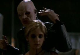 Master descends from his stage to fight. He snaps Buffy's neck and she