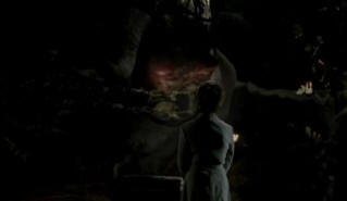 over his shoulder, Buffy notices a creature with it's eyes sewn shut