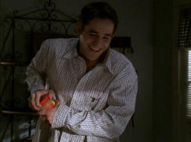 Buffy has replaced his regular water with holy water. After he explodes