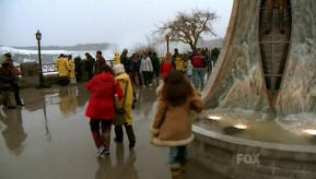 Jaye goes to look at the falls. Eric walks past, heading home from work.