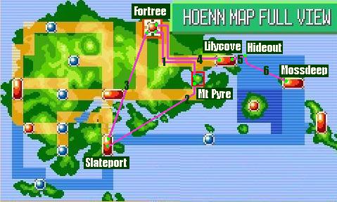 Beat the trainers here, and go to archie/maxie. Maxie will take the blue orb, and Archie Will Take The red orb. He will then leave for slateport. The old lady will give you the red/blue orb. Leave from Mt.Pyre, and surf south, to route 123. On route 123, head south, then west. At last you will come to the sea. Surf west to come to mauville. Go south to come to Slateport. Go to the harbour, and team aqua/magma will steal the submarine! Head back to fortree city, and then go to where the safari zone is. Instead of going south to Mt.Pry, go east and you will come to Lilycove City.
