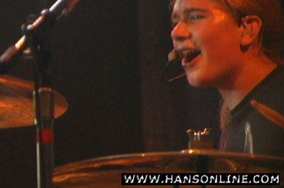 I wish to explain what they were wearing. Isaac was wearing a grey button down shirt, with a white wifebeater underneath. (he likes water. he drank like four bottles while on stage) and jeans. he didn't sing a whole lot, but he was thoroughly enjoying himself. it was just that look in his eye, while watching this crowd go maniac, and his smile when he sang. Taylor, being the sexy hottie he is, wore a dark blue button down shirt, with brown cords. (note: his blue shirt awas disguarded toward the end of the concert, showing us his buff upperbody, in a black tank top. mmmm yum.) And Zac. He was wearing a black harely teeshirt and dark blue jeans. His hair was pulled back into a low pony, and yum. he was showing off a lot of the time... playing his drums with one hand. |