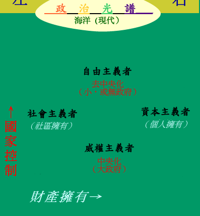 ![]() 根據傳統光譜,共產主義和法西斯好像是兩極的差別,但以現代的政治觀點,兩者其實相近,都是極權架構。我們也常說,國民黨和共產黨(中國的左右派)是孿生兄弟;這是根據類似的道理[註]。有人把傳統單向的光譜做點修正,將左右接在一起,形成環狀的光譜。但這樣一來,在這接點(共產極權/法西斯極權)對面的,絕對不應是「中間溫和」,而順理成章地,應該是主張非統治的「無政府主義」(anarchism)。所以傳統光譜不再適合現代政治生態的描述,所以出現下半的現代(海洋)觀點的兩向光譜。 近幾年台灣的自由民主,加上社區主義傾向,產生簡化政府的呼聲和行動,使台灣政權有由右下角法西斯向中央調整的樣子。與其說「調整」,好像意涵有秩序和計畫,我想,不如說是向其他 3 個方向鬆綁、解散,或許是比較準確的現況描述(參考上面「海洋」政治光譜部分)。美國的主流政治傾向右上角。 注意,傳統光譜中的「自由主義」和現代的「個人自由主義」(或古典自由主義)是不同的。前者傾向「齊頭平等」的社會主義主張,後者傾向「立足點平等」的資本主義主張。本站海洋+脫漢的立場,當然是站在現代政治光譜的上半;和中國式,台灣傳統式,或一般漢族政治,可說壁壘分明,比如,本站支持的政治獨立,不會去考慮和中國成為漢族意義的「兄弟之邦」。 注意力放到現代海洋架構上,習慣另一套名稱的讀者,可以參考下一圖: ![]() 台灣資本家和集權政府哥倆好的情況,甚至稍早KMT無恥公然交媾的黨國資本主義,正是傾向右下角;這和上一圖相吻合。 幾句奉勸台灣政客: 本站不尚政治,但上面既然談了政治光譜,就順便奉勸政客幾句。 以前,世界只生產黑色的汽車(台灣叫「黑頭仔車」);那時美國拖拉斯主義盛行。漸漸地,消費者不再沈默,要求個人特色的汽車。當時獨占市場的亨利•福特就蠻橫地說:「你可以選任何自己喜歡的顏色,只要它是黑色的。」(You can have any color you want as long as it's black!) 這段故事,現在已成為自由市場的大笑談。 目前台灣的漢族沙文政客,就像那樣子在經營獨霸市場。他們的「新中間」只是"新標籤",他們以不變應萬變說:「你可以有任何政治立場,但我就只提供醜陋的法西斯主義(包括來自中國的威權統治者+資本家)服務」。奉勸這群政客們最好快長進,加緊充實服務菜單,不然我看不必多久,你們就會成為民主自由社會的大笑話。 [註] 一個適切的比喻就是:共產主義要求把牛都交給國家,而由國家把生產的牛奶分給人民;而法西斯是讓人民擁有牛隻,而要求把牛奶都交給國家 -- 就像我們民間的流行說法:中華民國萬萬"稅"! |