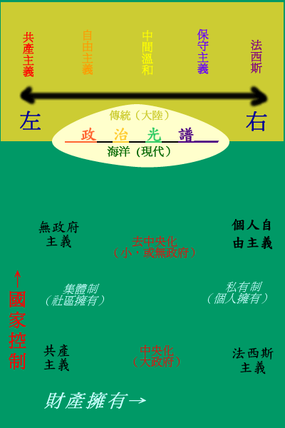 政治生態可以無限複雜,但最通常是以「政治光譜」來標示各種政治傾向。以下就是本網站所本持的政治光譜: