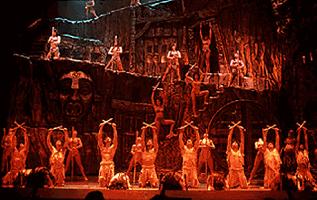 讓我們將目光由百老匯一下子移去拉斯維加斯。那是一個賭場的集中地,美國人花錢享樂的地方,而有娛樂的地方恐怕便得要有音樂劇的出現。與百老匯音樂劇不同的是,於賭場上演的音樂劇大部份都不會傾向設中場休息,而表演亦就以金碧輝煌、燦爛奪目為主,這樣才能吸引更多人去玩樂消費。由MGM Grand Hotel所製作的這套作品嚴格來講可能算不上是音樂劇,除了歌曲有些是前人作品以外,此劇其實也沒有甚麼劇情主線,更別提內涵之類的東西了。然而,要講製作的奢華,這套四千五百萬投資的製作可真的是讓人目瞪口呆的。除了一般常有的東西以外,此劇的巨大會動的龍模型、在場上仿飛行效果的飛行機器、能夠立於台上的馬戲團佈景和表演,加上了電影投射和幻覺特技,一切都是讓人嘆為觀止的。
