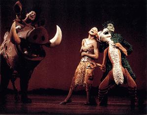 迪士尼公司把卡通搬上舞台又一成功例子。自從迪士尼把"美女與野獸"成功搬上舞台並獲得廣大的觀眾支持後,便野心勃勃的想把自己電影動畫之中票房最高的傑作"獅子王"也一併將之製作。跟"美女與野獸"不同的是,因為"獅子王"中的角色壓根兒便沒有"人",化妝、服裝以及模擬出所有動物的正確比例便成為了整套音樂劇的最大阻力。跟傳統音樂劇不同,此劇的名星不是裡面的人物角色,又或是作曲的流行音樂界巨擎Elton John又或作詞家Tim Rice,而是身兼導演及設計兩個此劇賣點的職務的Julie Taymor。她成功的引入了木偶、面具,以及形象百變的服裝來把整個非洲草原搬上百老匯,此舉堪稱百老匯設計史上的里程碑。