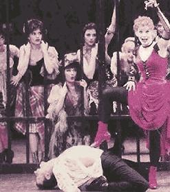 二人離開並答應會回來,這讓艾茜感到興奮。("I Feel Merely Marvelous")為了更進一步,艾茜說動了莎拉幫她說謊,把自己弄成被兇手追殺不果,莫狄上當果然召來警察。另一邊廂劇場裡佐治正在排練,("The Uncle Sam Rag")艾茜闖入來要湯姆保護她。佐治提議讓艾茜留下,劇院裡人多兇手定然下手困難。雖然艾茜的表演並不算好,("Erbie Fitch's Twitch")湯姆說服了經理哈維,在佐治的化妝幫助下艾茜成為了一個不起眼的合唱女。路芙的朋友查爾斯爵士聽聞艾茜的事想跟她見面,卻被湯姆拒絕。佐治指湯姆戀愛了,湯姆卻厚著臉皮否認,("She's Not Enough Woman For Me")卻約艾茜共晉晚餐。